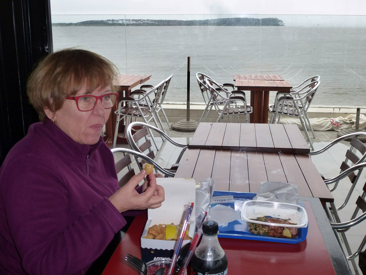 Punta del Este: Puerto - Bea come pescado con Isla Gorriti al fondo
