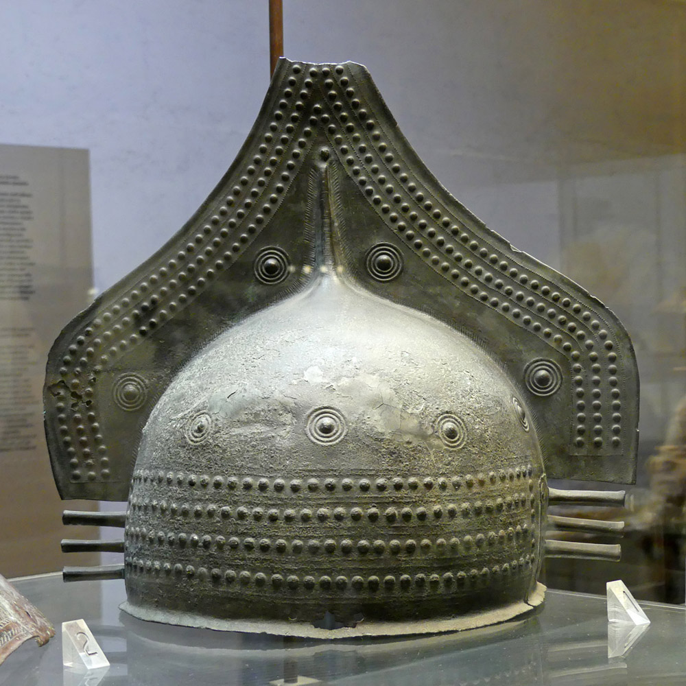 Palazzo Vitelleschi: Elmo crestato - bronzo etrusco, s9aC