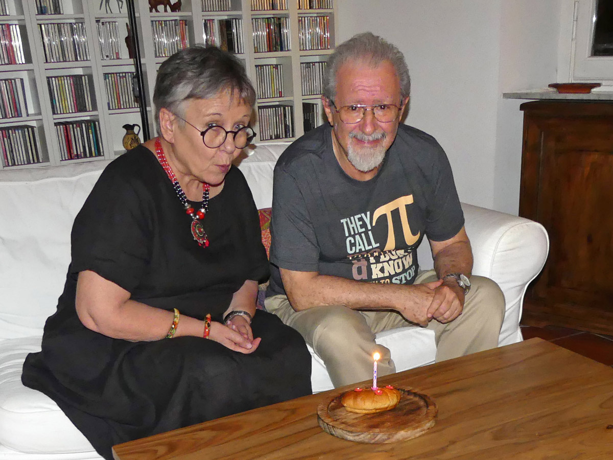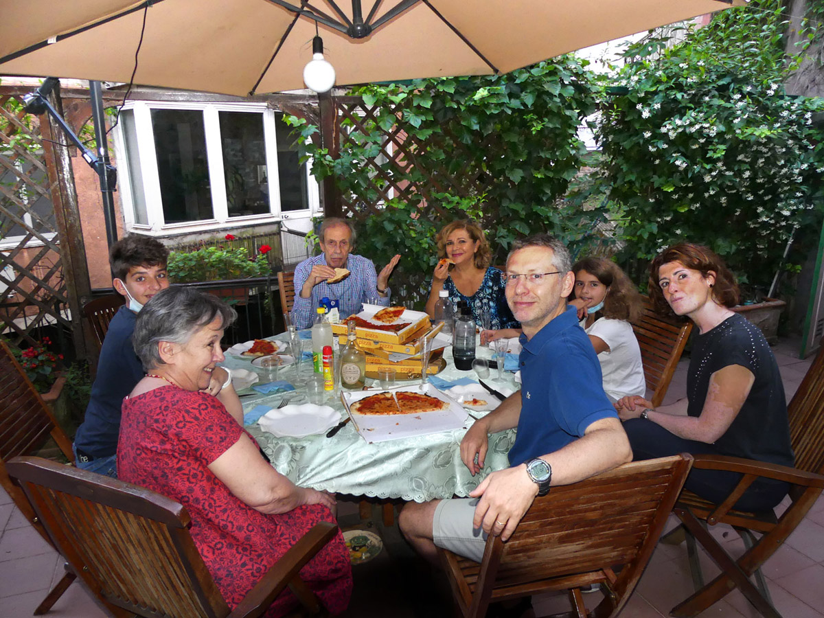 Monteverde: festa del 75º compleanno di Claudio: Riccardo, Bea, Renato, Franca, Andrea, Sara e Francesca mangiano la pizza